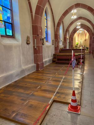 Die Orgelrenovierung hat begonnen: Die Empore der Kirche St. Nikolaus in Jügesheim ist eine Baustelle, das linke Seitenschiff dient als Werkstatt. Der Zutritt zur Kirche ist nur zu den Gottesdiensten möglich.