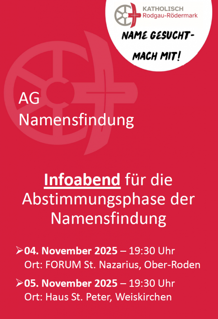 vom 6. September – 5. Oktober 2025 hatten Sie die Möglichkeit, Ihre Vorschläge für den Namen unserer künftigen Pfarrei einzureichen, die zum 1. Januar 2027 gegründet wird.